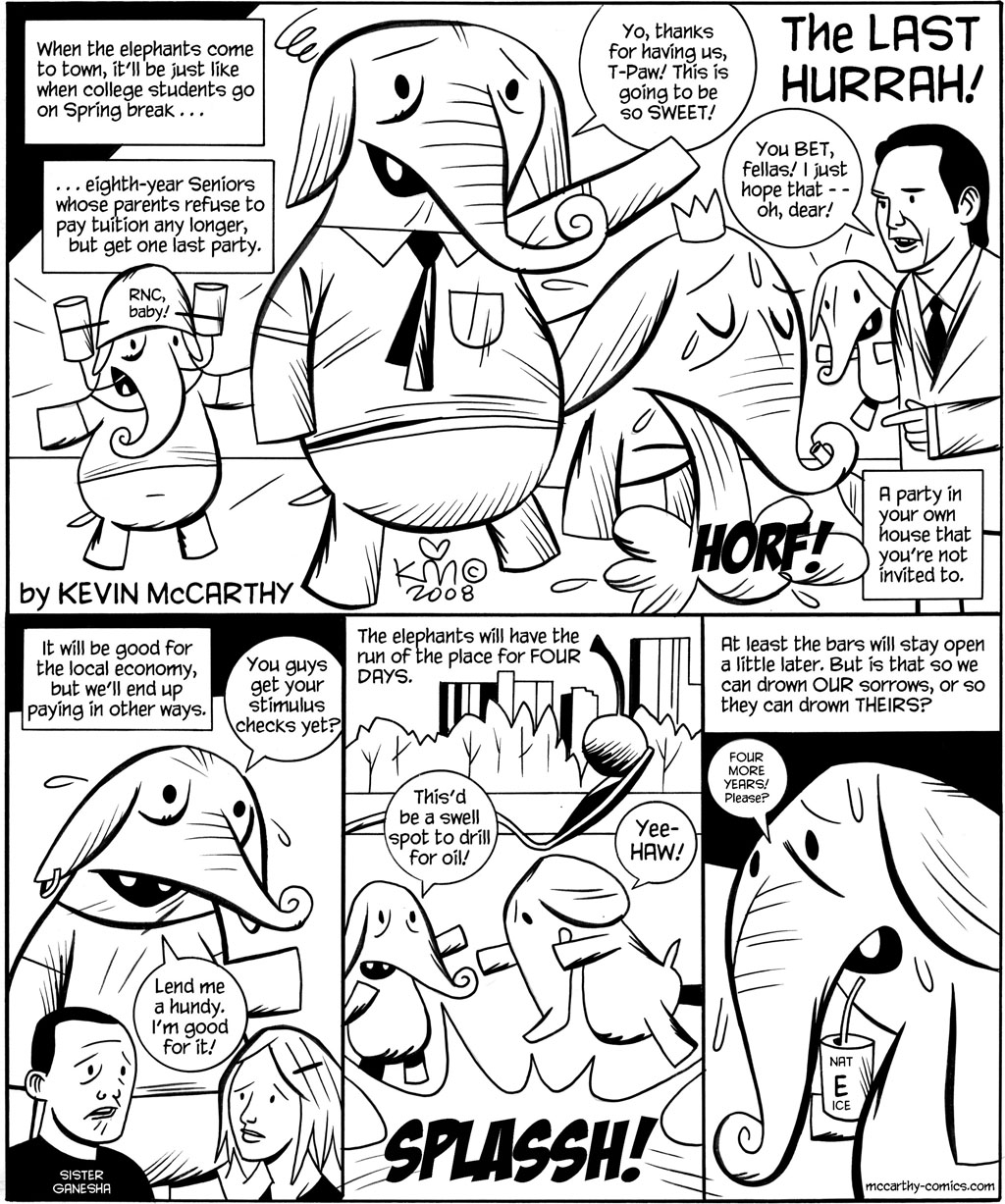 This strip originally appeared in the City Pages, a free weekly newspaper in Minneapolis/St. Paul. It was part of the cover story, a collection of cartoons about the 2008 Republican National Convention (the “elephants”) coming to town.