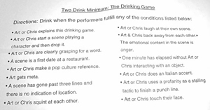 So you’re sold, We get it. You just need the essential information. The show is tonight (Tuesday) from 8-10pm. Mention this column and Art will buy you drink. If you happen to have a caricature of yourself at the top of this page you don’t need to buy a drink all night. As an added bonus for our first show you can catch us doing our drinking-game-based show Two Drink Minimum. Check out this link to our first show as compensation for this column being mostly a shameless plug.