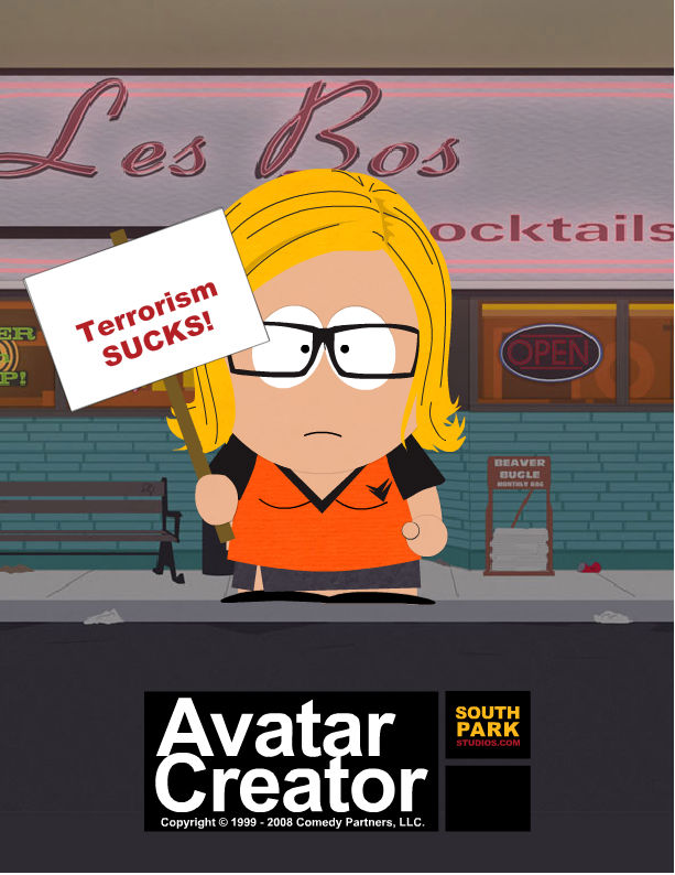 Show your support! Turn yourself into a South Park avatar! I made the following personally-representative design choices: 1) I’m standing in front of a nightclub; 2) wearing a Star Trek uniform; 3) blond; 4) with the maximum of three accessories from the selection menu – a protest sign, big black glasses, and cleavage…