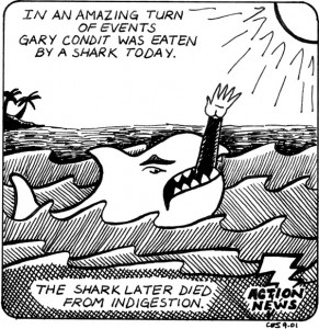 What did we have to fear? Sharks! Sharks in the water, eating swimmers! Scary, scary sharks!