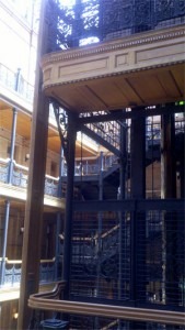 The building inside is populated by real world Deckards, Internal Affairs officers who try to rid themselves of villains who look like them, all the while wondering if the view they have of themselves as good guys has been manufactured. The building is like a person, the outside a façade that looks different from what is inside. The first floor houses retail stores including Ross Cutlery where O.J. Simpson bought the stiletto that was a point of investigation during his murder trial. Inside, it is the place that Thomas Pynchon wrote in Gravity’s Rainbow where Philip Marlowe “…would feel homesick for the lacework balconies.” The balconies and handrails and elevators are entwined with a lush garden made of wrought iron. The ceiling is made of glass and lets the urban sunlight flood the space of the central atrium and make the metal vines seem to grow.