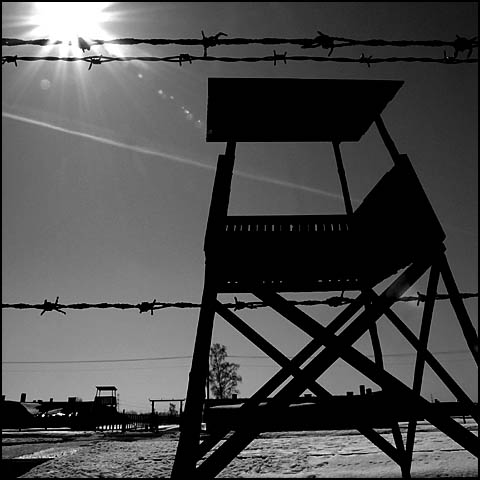 Photo of Auschwitz guard tower, by Bill Hunt, to commemorate the 60th anniversary of the camp in January 2005.