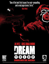 There are many a great things I can say about Jai Nitz and Greg Smallwood’s The Dream Thief (Dark Horse Comics), like the intricate and graphically powerful page layouts, the naturalistic dialog and the true-to-live friction in the relationship between the lead, John Lincoln, and the women in his life. Smallwood’s characters “act” quite well in their close-ups, and the coloring is stylized, but to the point of being distracting. However, the southpaw curve ball that Nitz throws at us a little more than halfway through this first issue, amps the story quite a bit and took me to an unexpected place.