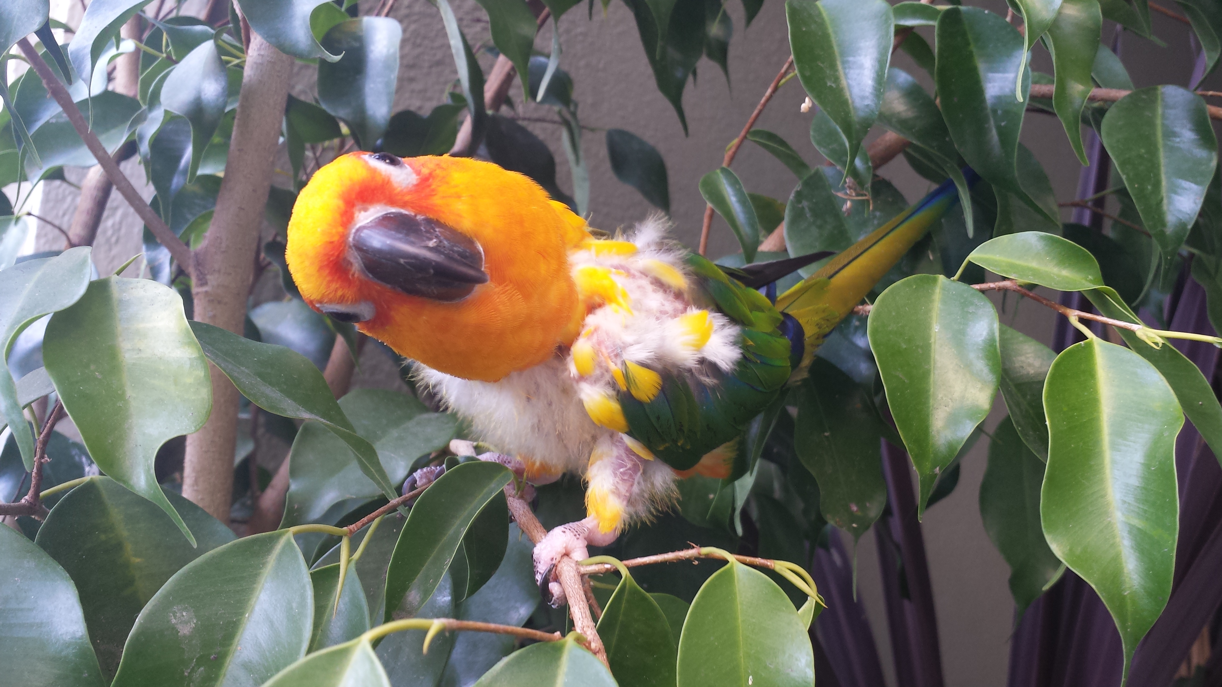 Mia the Sun Conure pulled out her feathers.