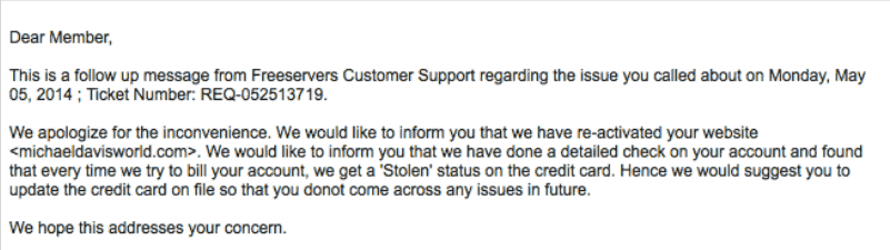NONE of those was EVER the cause for you shutting down my account. My credit card was, is, and has always been valid. Your email states today that the website has been reactivated, and again it says it was MY fault that the card was reported stolen.