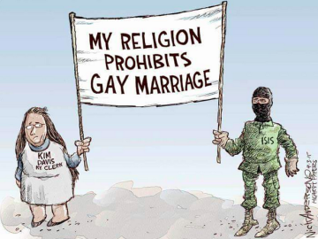 Which brings me to my point. If your religion will not allow you to perform the legal duties of your job, you should find another job. Kim Davis’ job included signing marriage licenses. A marriage license is a document, issued by the State, that becomes a civil contract between the two adults who sign it. It is not a sacrament, unless they formed a new religion while I wasn’t paying attention and now the United States bureaucracy is a deity.