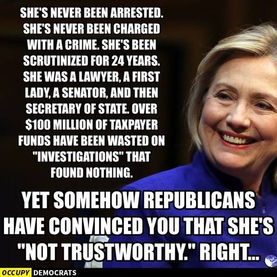 First of all, let’s talk about the so-called scandals surrounding Hillary. I’ve heard a lot of people say she must have something shady going on because there are so many stories about her. That whole, “Where there’s smoke, there’s fire,” thing. However, just because a lot of people have suspicions, that doesn’t make the suspicions true. In fact, none of them have, as yet, panned out. For a systematic run-down, I recommend this. It quotes Jill Abramson, “a former reporter for the Wall Street Journal as well as former Executive Editor of the New York Times” as saying, “As an editor I’ve launched investigations into her business dealings, her fundraising, her foundation and her marriage. As a reporter my stories stretch back to Whitewater. I’m not a favorite in Hillaryland. That makes what I want to say next surprising. Hillary Clinton is fundamentally honest and trustworthy.”
