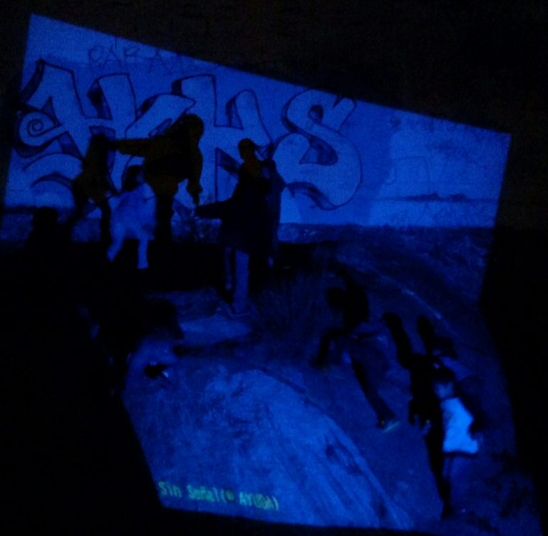 Picture from my cell phone, of the wall at ‘the Colony’ public housing complex in Tecate. While we set up for the movie, the children who live there played in the light of the projection.